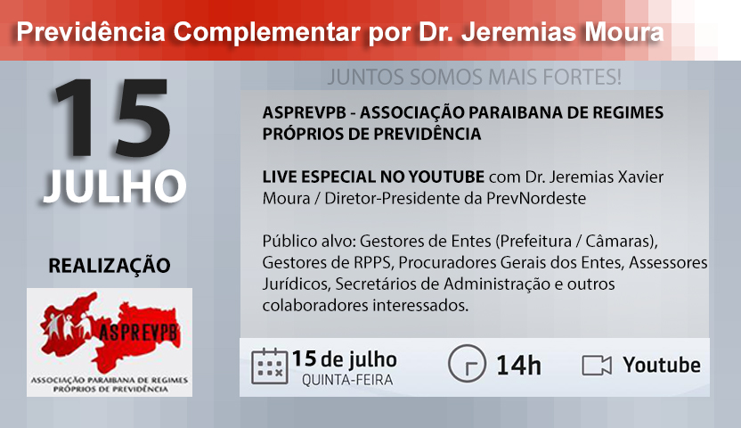 Próximo dia 15/07 (quinta-feira), a partir das 14h, em sua plataforma do Youtube, a ASPREVPB promove mais uma live especial sobre Previdência Complementar, com Dr. Jeremias Xavier Moura, Diretor-Presidente da PrevNordeste.