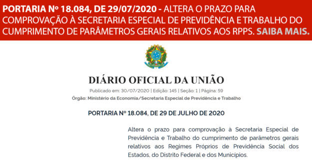 A Secretaria Especial de Previdência e Trabalho, do Ministério da Economia, publicou no dia 30.07, a Portaria nº 18.084, que altera o prazo para comprovação à Secretaria Especial de Previdência e Trabalho do cumprimento de parâmetros gerais relativos aos Regimes Próprios de Previdência Social dos Estados, do Distrito Federal e dos Municípios. Fonte: http://www.in.gov.br/en/web/dou/-/portaria-n-18.084-de-29-de-julho-de-2020-269399402